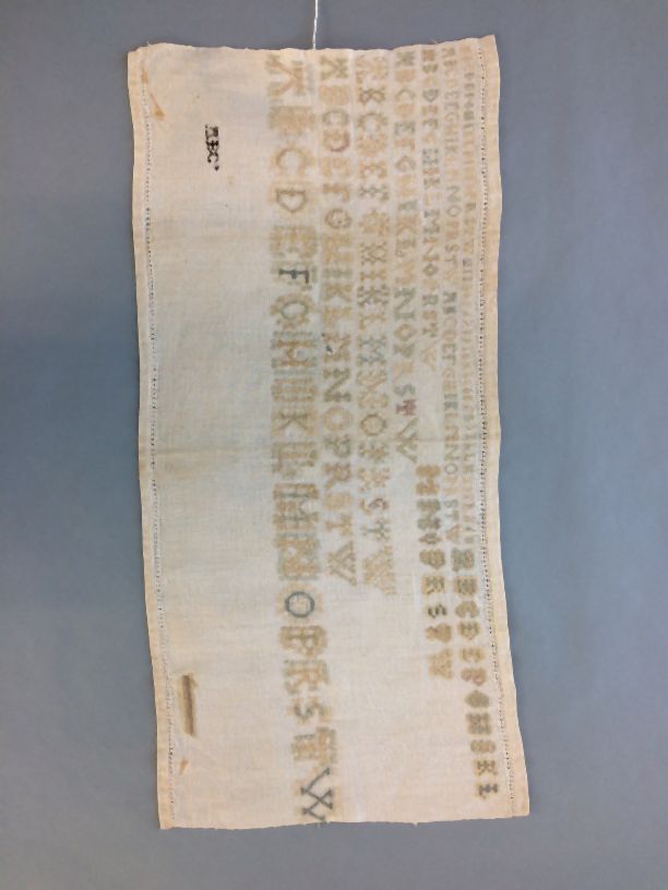 Letterlap van wit linnen met zijden borduursel, tien alfabetten één cijferreeks en enige letters, groen, beige, geel, oudroze en zwart