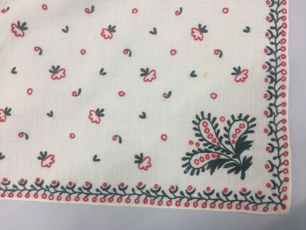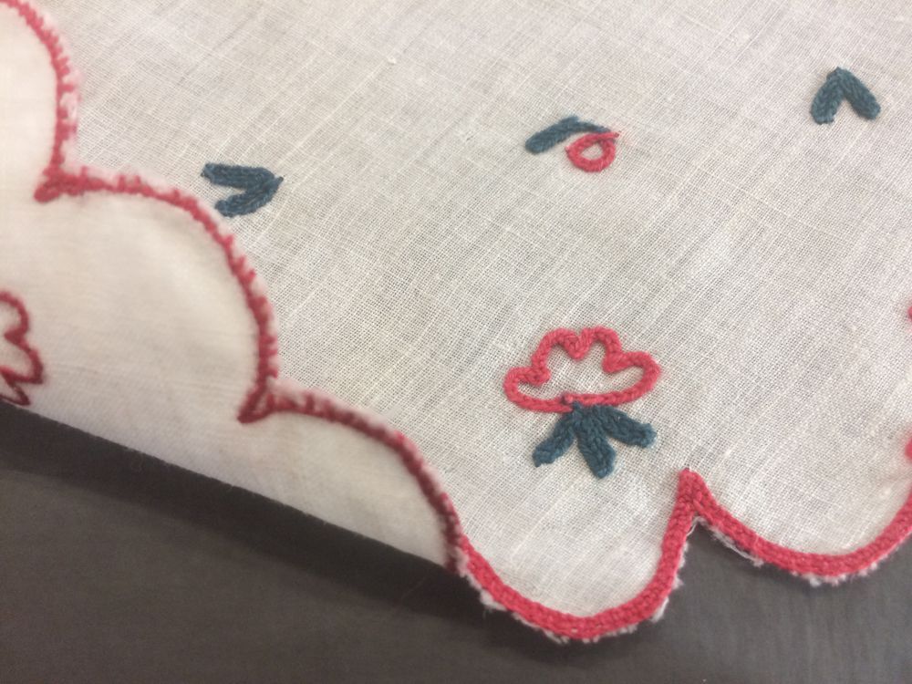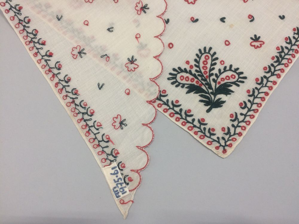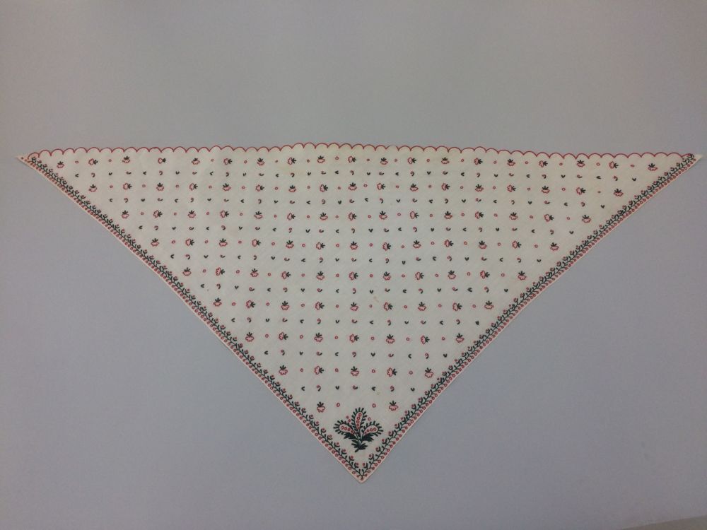 Driekante getamboereerde tipdoek van witte batist met blad- en strooimotieven