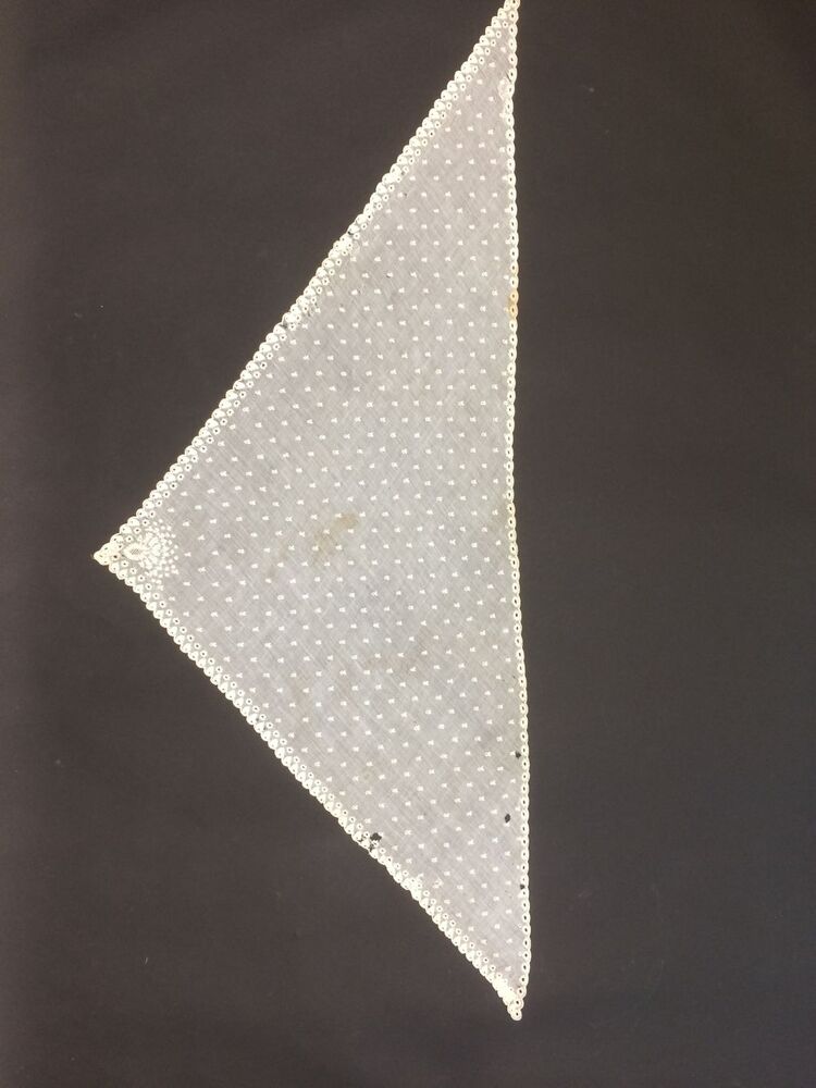 Driekante doek van wit neteldoek getamboereerd met wit katoen met kleine bloemetjes