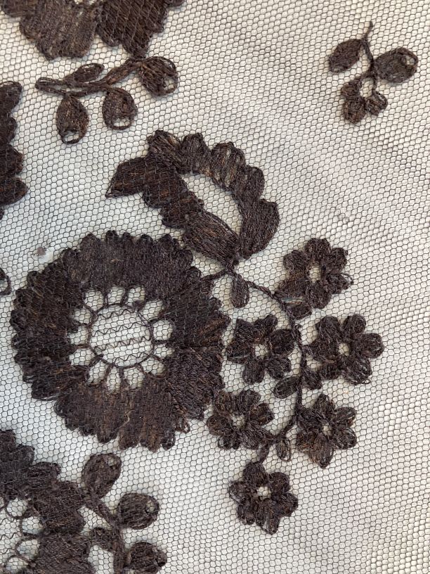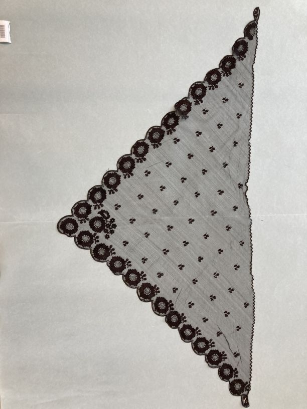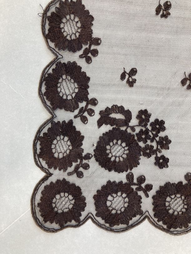 Fichu, zwarte tule met zwart garen doorgestopt, met bloemenrand met bolle bloemen