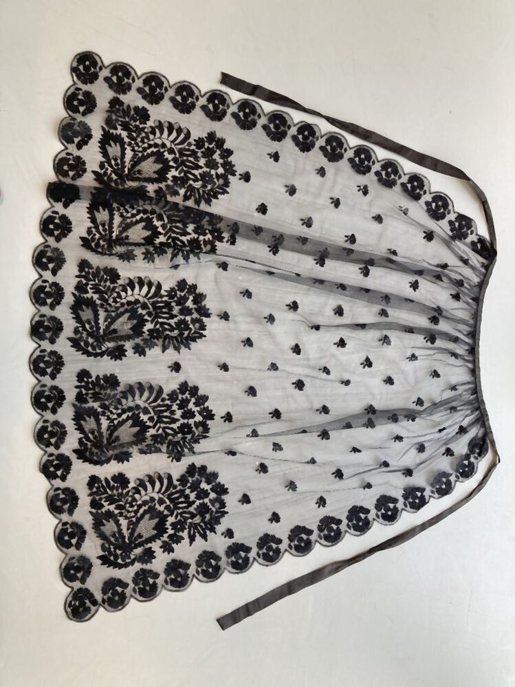 Schort van zwarte tule doorgestopt met bloemen en bladen, met tailleband van zijden lint
