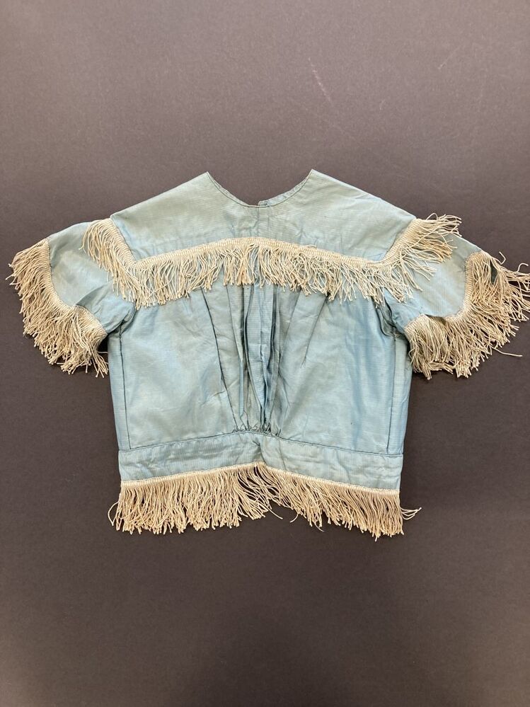 Bovenlijfje voor kind van lichtblauwe taftzijde afgezet met franje