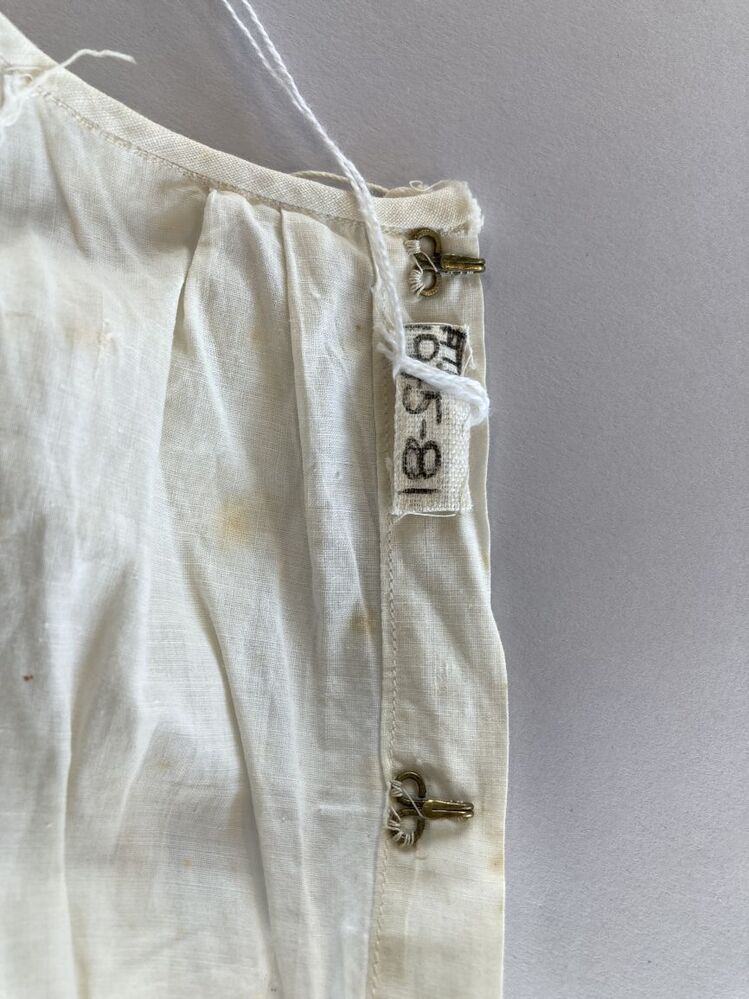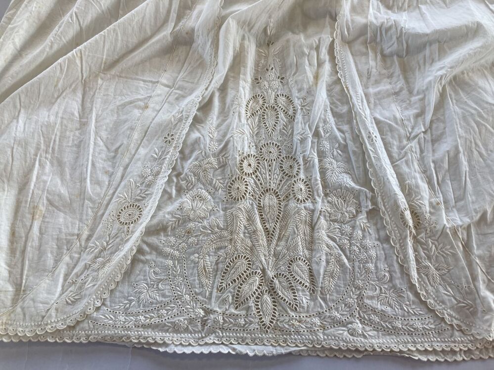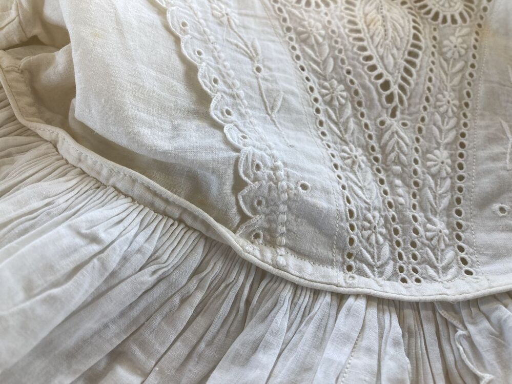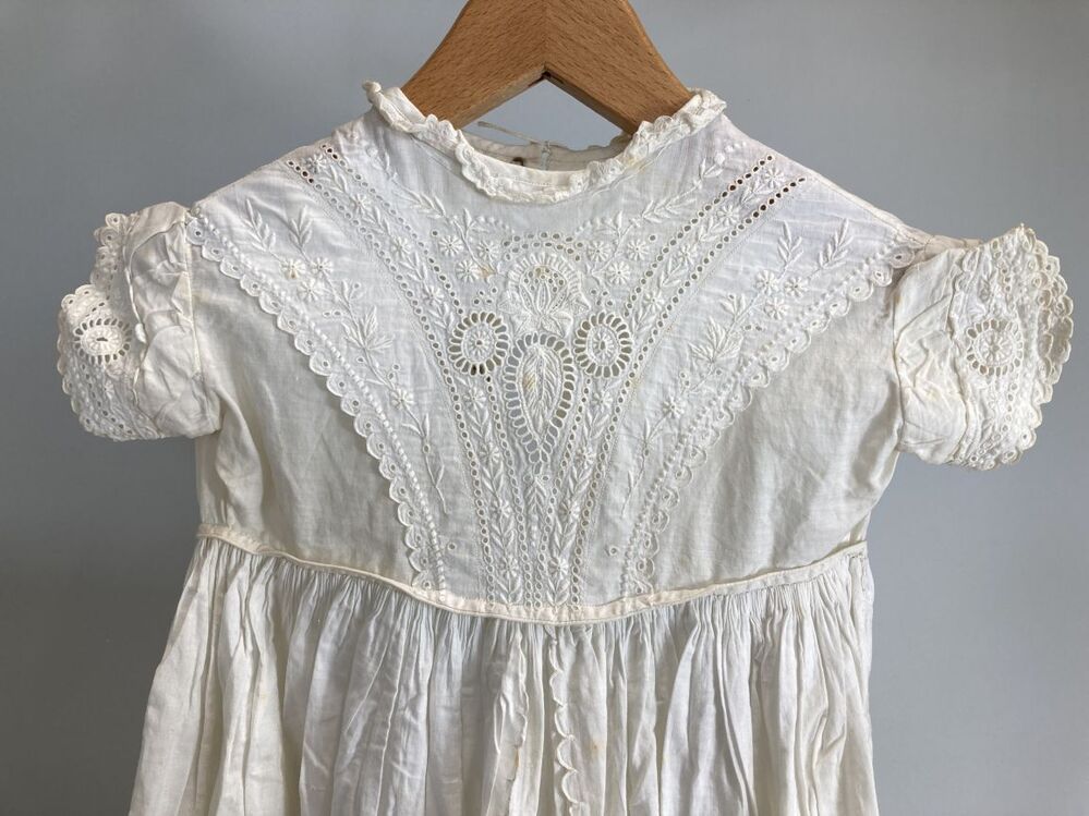 Doopjurk van wit batist met driehoekig wit borduursel op lijfje en op quasi onderrok