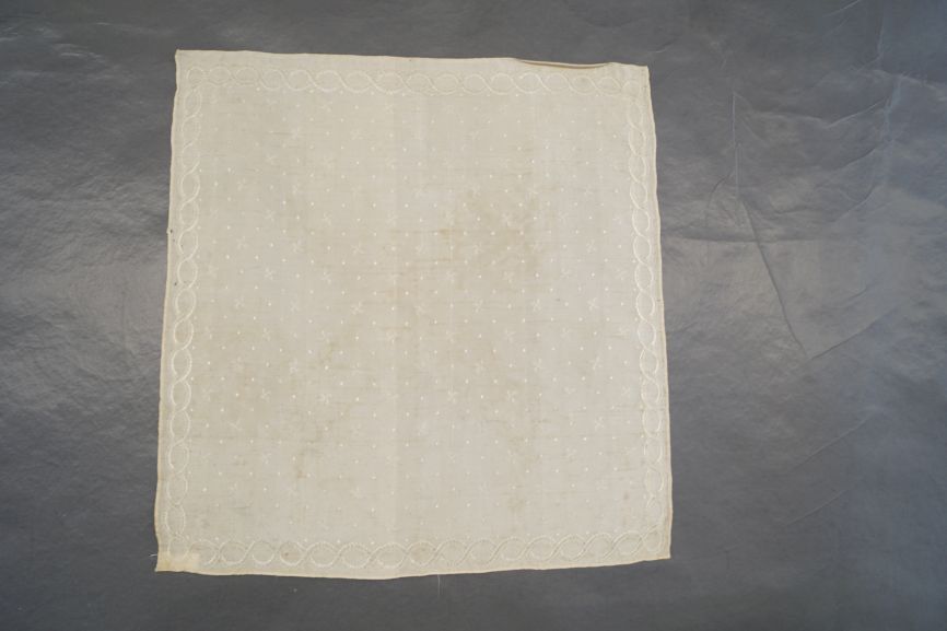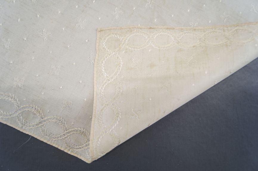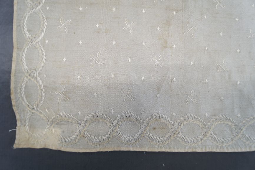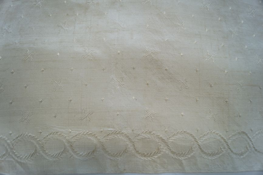 Vierkant sjaaltje van crème zijde met ingeweven rand met om elkaar slingerende guirlandes en swastika patroontjes op het middenveld.