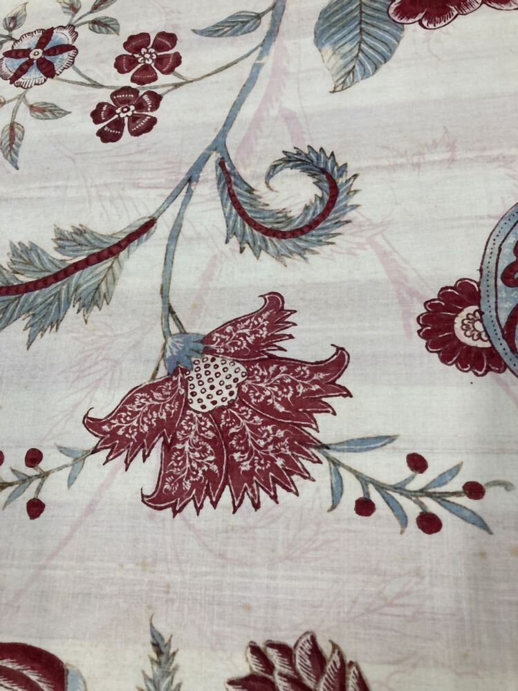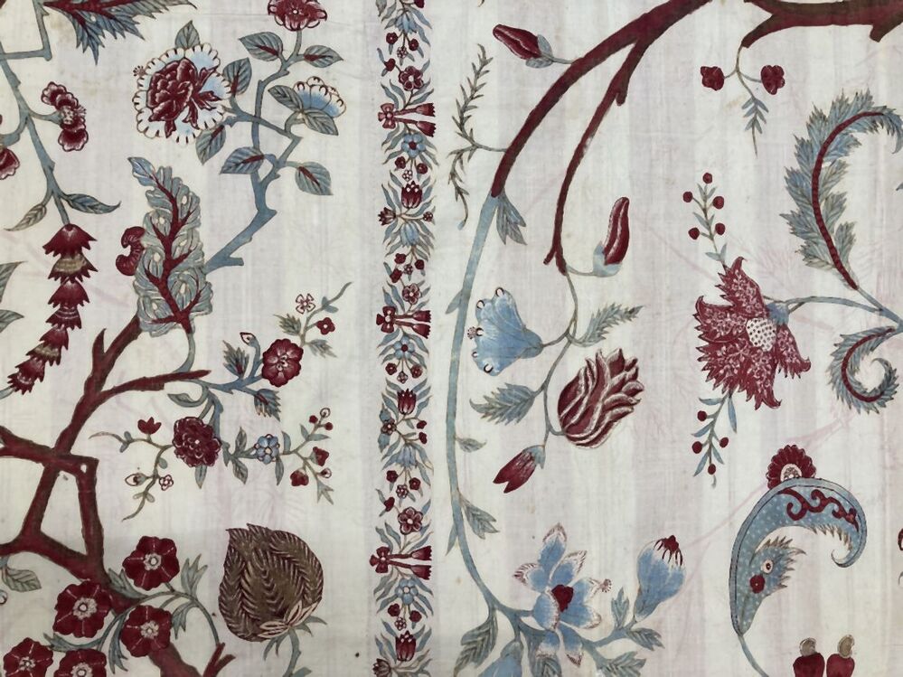 Sitsen palempore of wandkleed grote bloeiende boom op lichtblauwe berg, met kleine bomen in de rand op witte grond