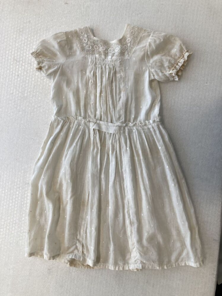 Kinderjurkje van wit genopt batist met pofmouwen