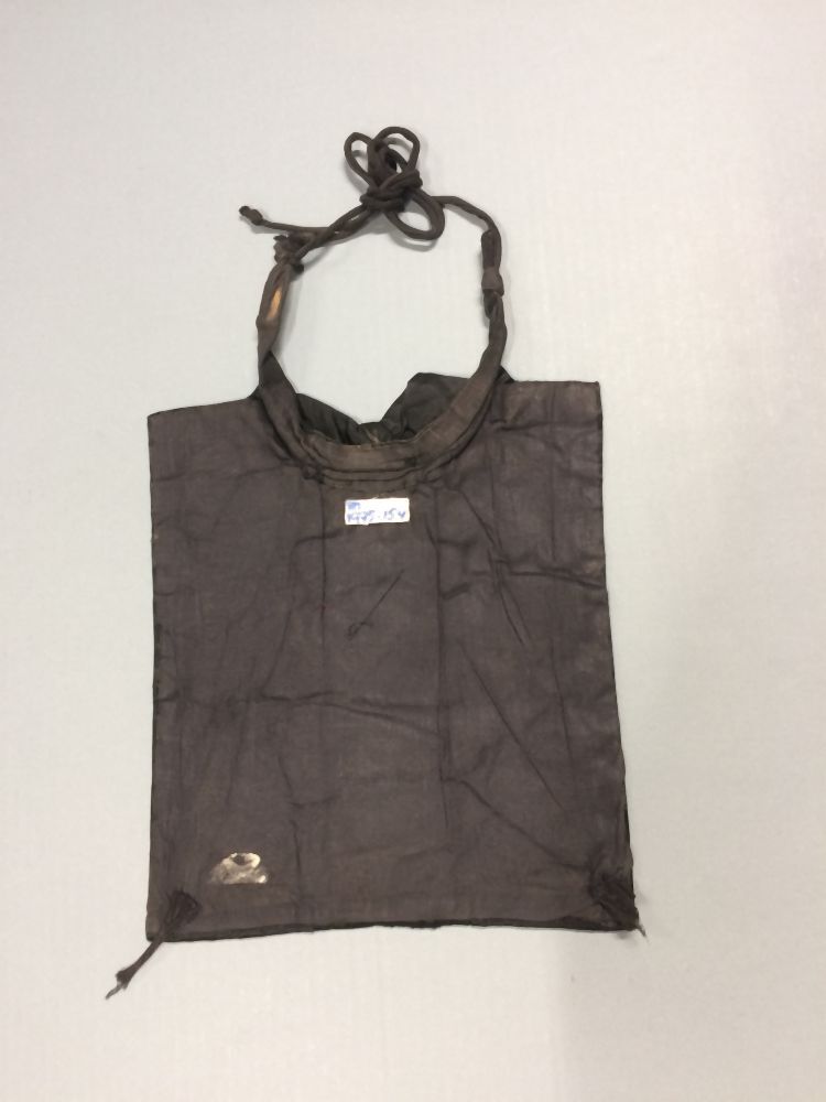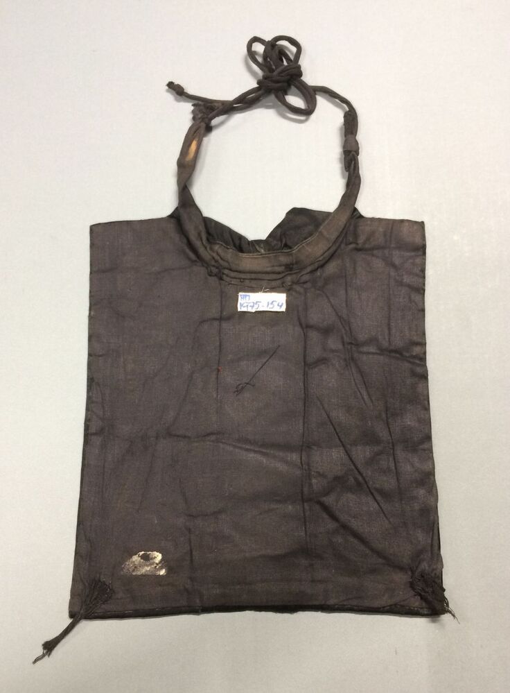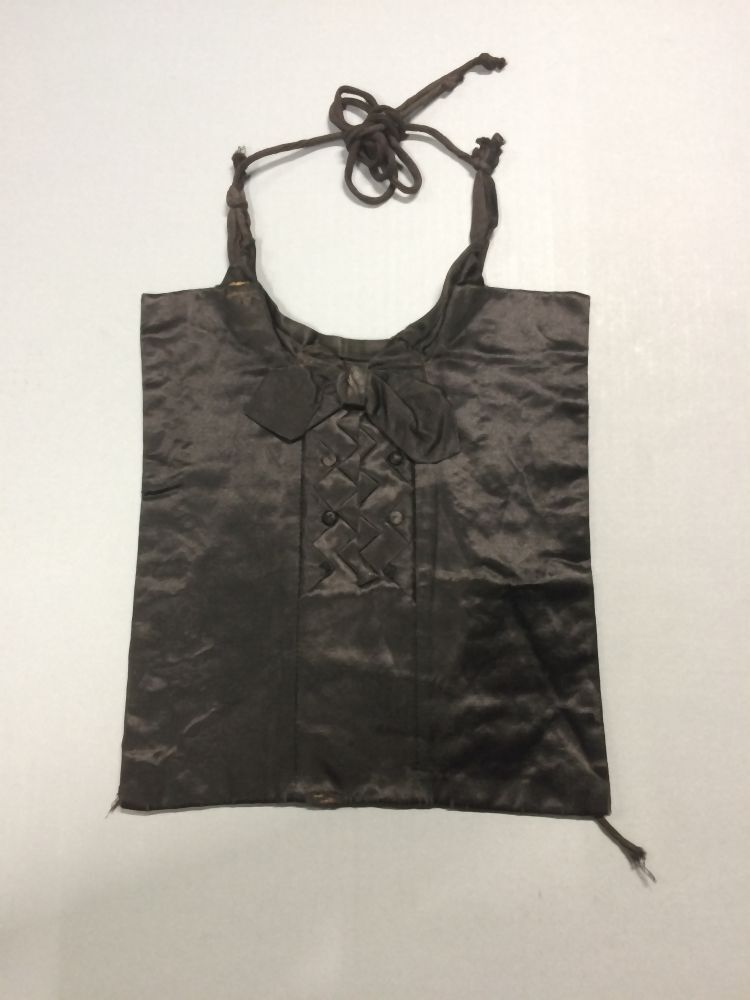 Dasfrontje man van zwart satijn, rechthoekige lap waarop een kraagje en een strik, de rechthoek verdeeld in drie verticale banen