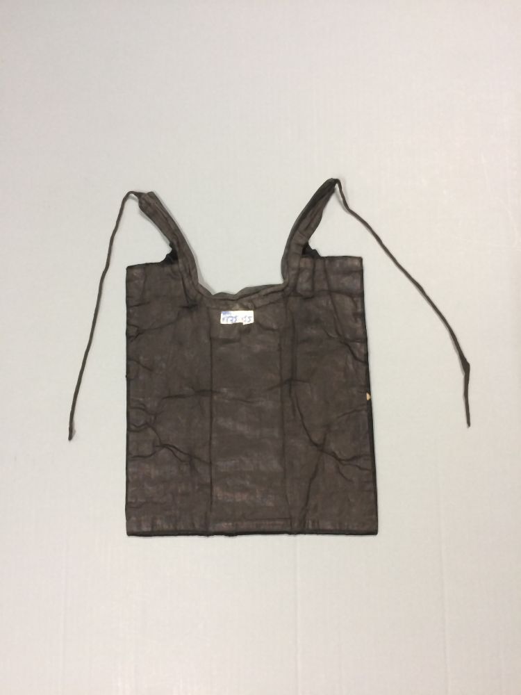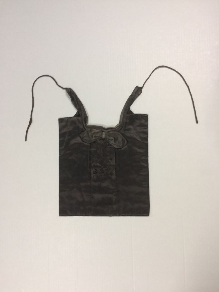 Dasfrontje man van zwart satijn, rechthoekige lap waarop een kraagje en een strik, de rechthoek verdeeld in drie verticale banen