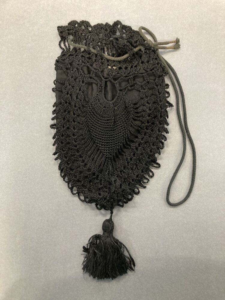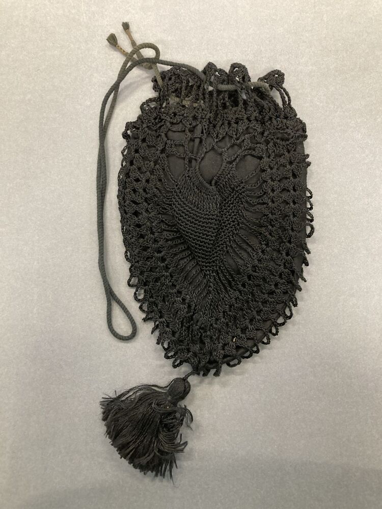 Tasje gehaakt van zwart rayon, gevoerd met zwart katoen satijn, aan onderzijde een zwarte kwast