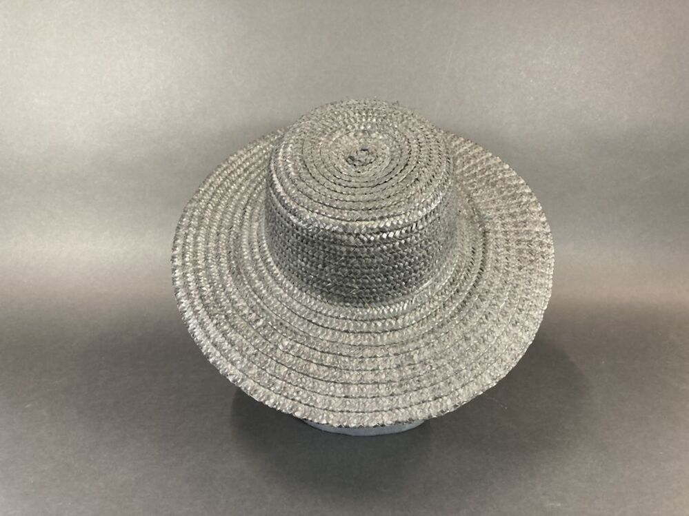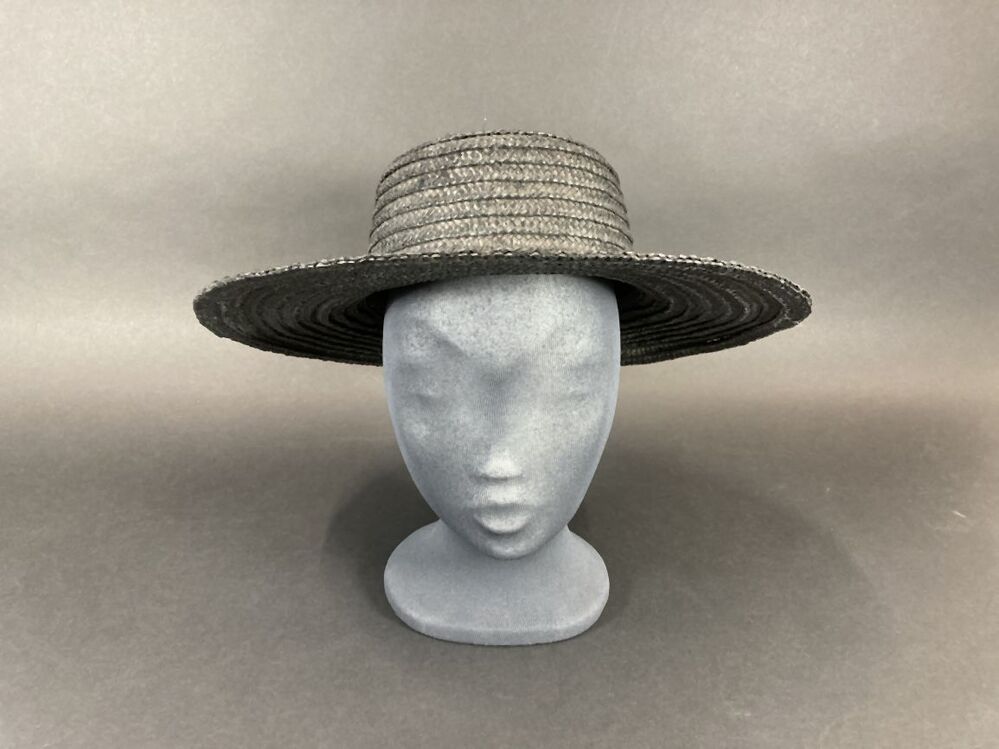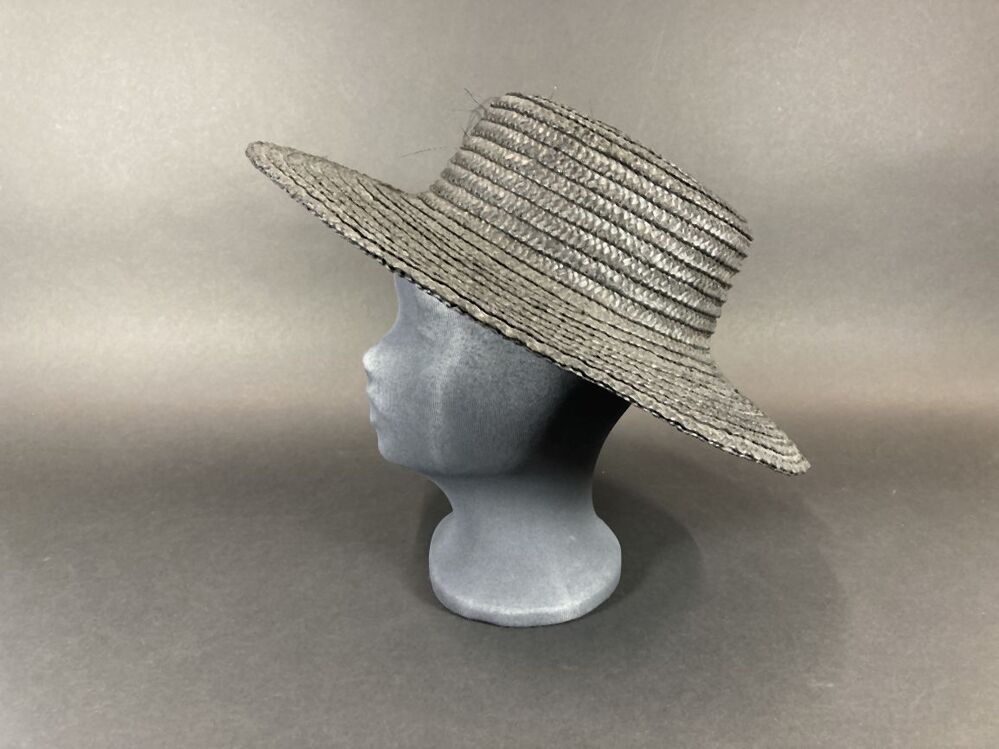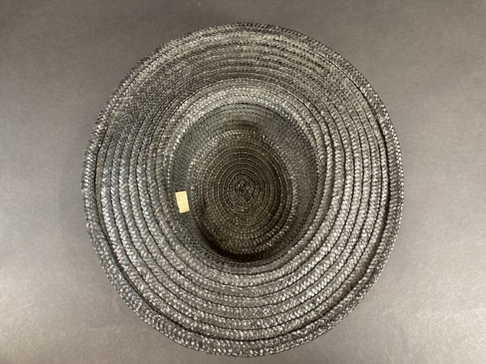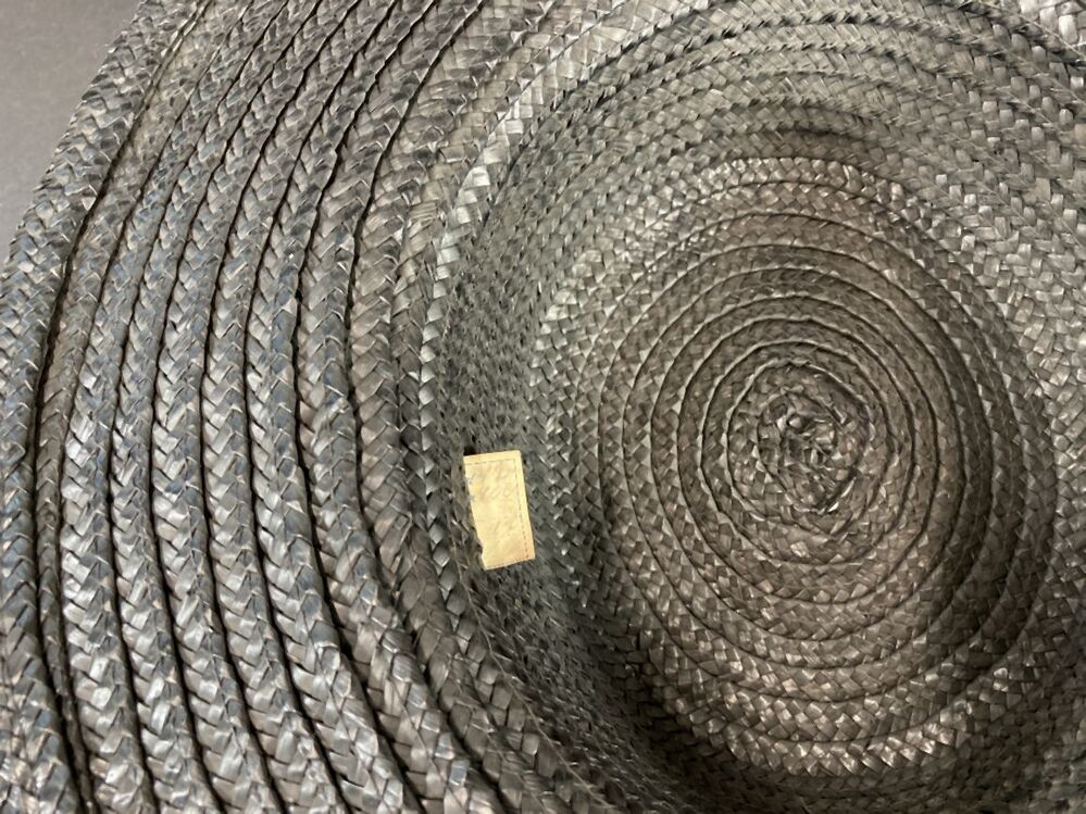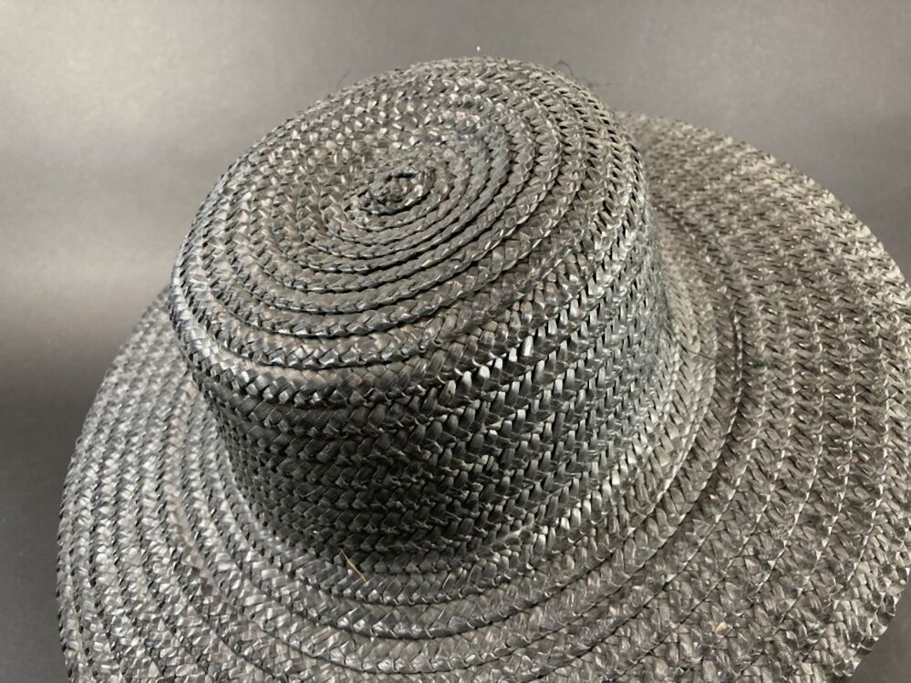 Zwarte hoed van gevlochten stroband met wijde platte bol en brede rand