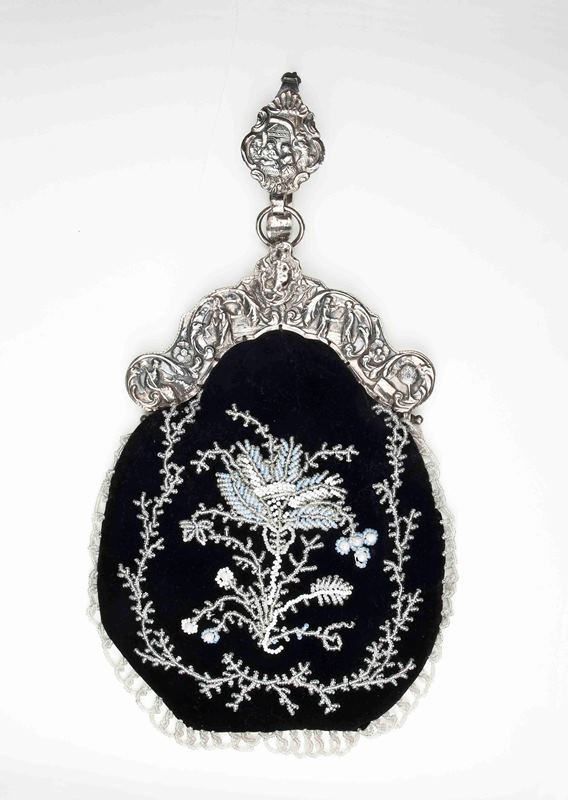 Zilveren beugel met rocaille krulwerk en personificaties aan zwart fluwelen tas