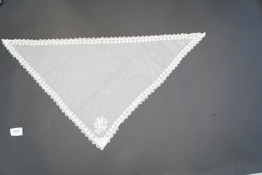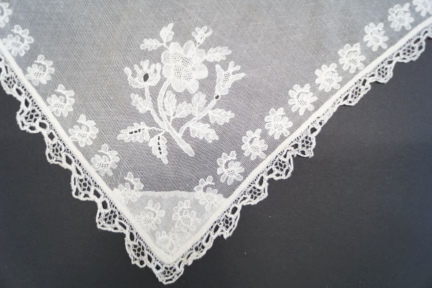 Fichu van witte tule met rand van florale motiefjes en een bloembouquet in de punt, afgezet met kloskant