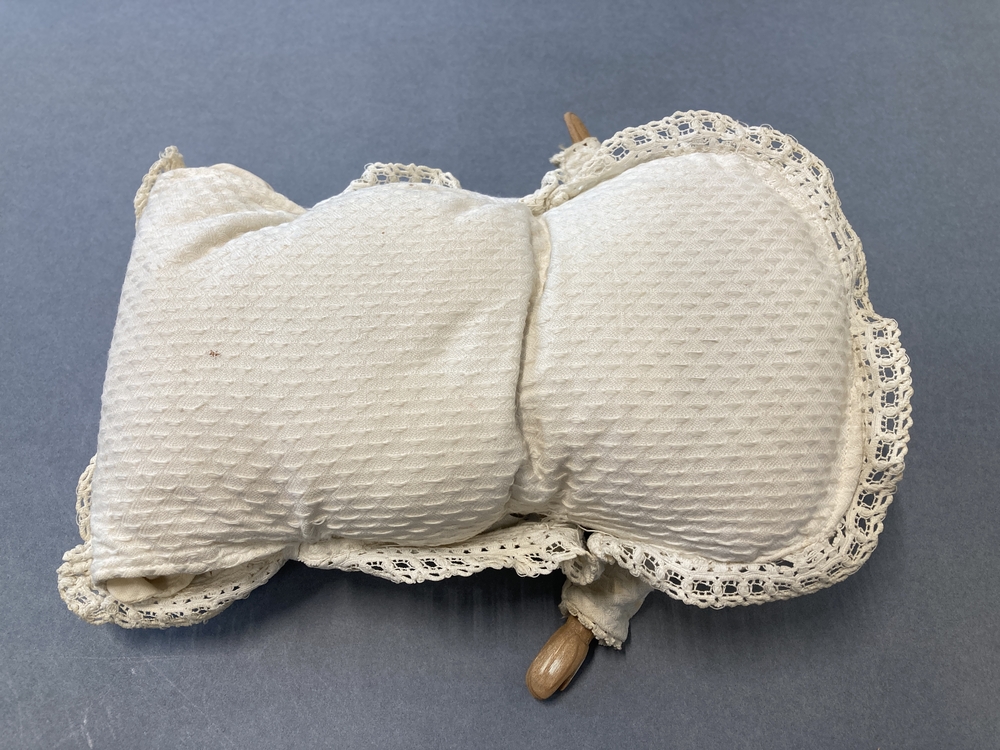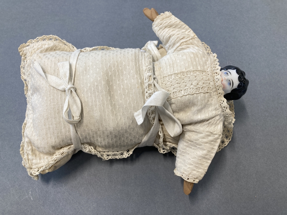 Popje in wit katoenen pique draagkussen gebakerd, met luiers, oorspronkelijk schildpadpopje vervangen door porseleinen schouderhoofd met houten armpjes