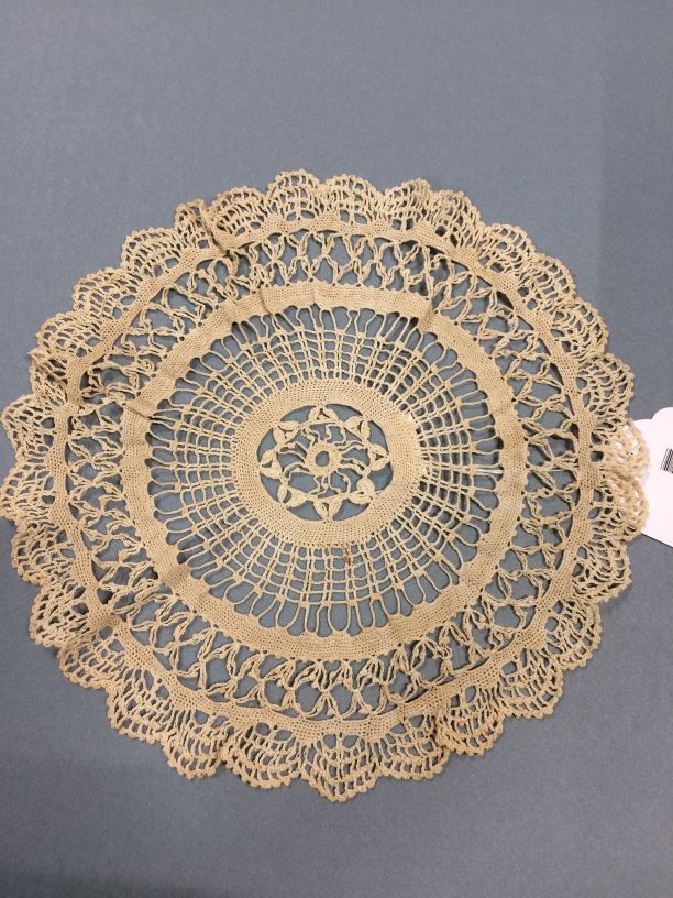 Rond kleedje gehaakt van écru-kleurig katoen met in het midden een achtpuntige ster