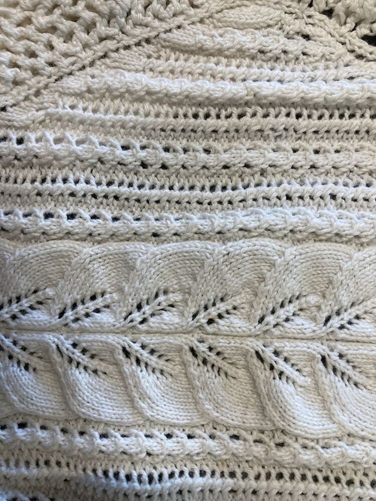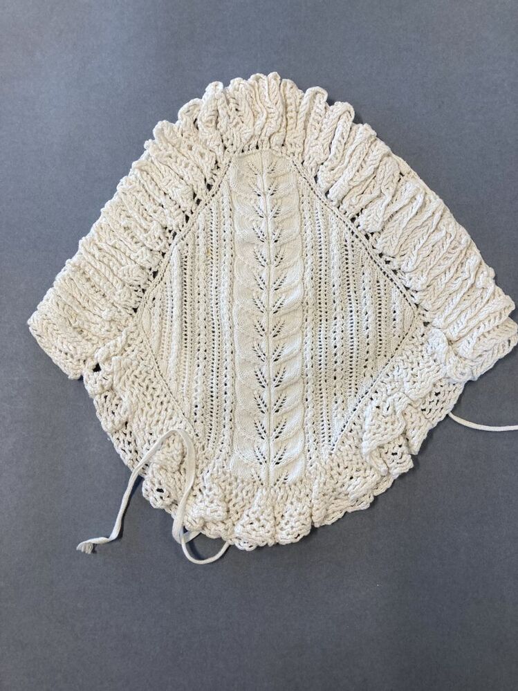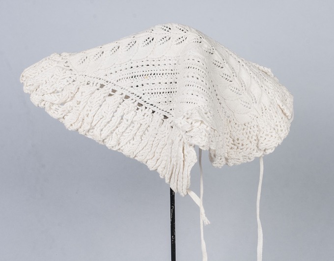 Morgenmuts van wit katoen gebreid met bladerrand en gestreept ajourpatroon