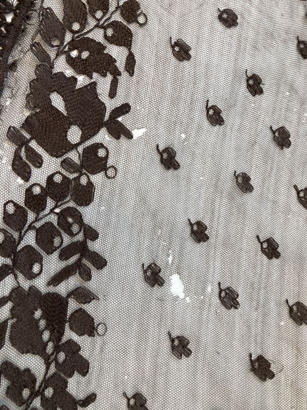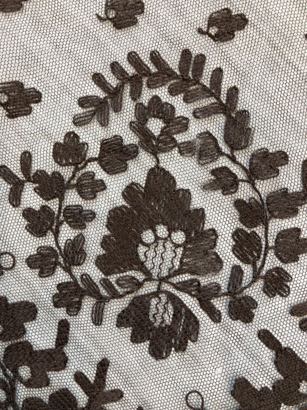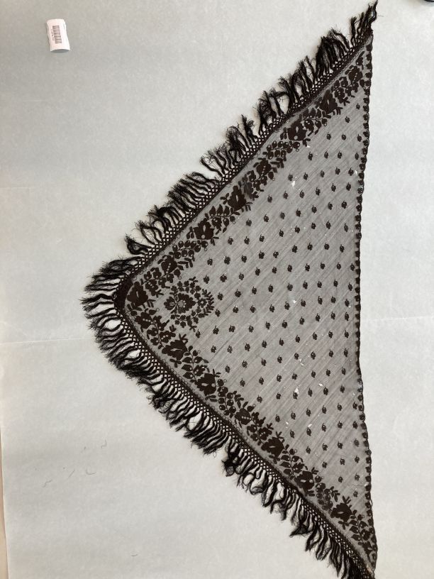 Zwart tule fichu met floraal doorstopwerk, langs de korte zijden een bandje met geknoopte franje
