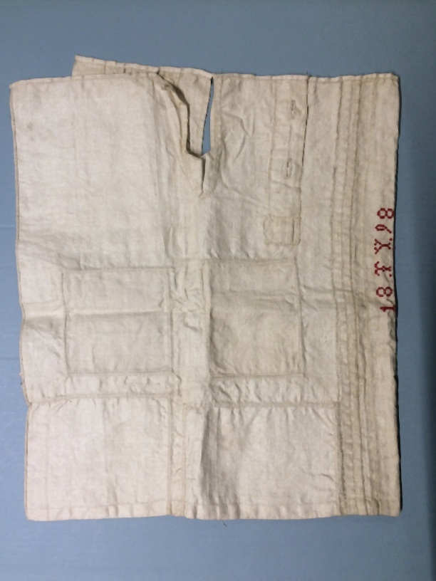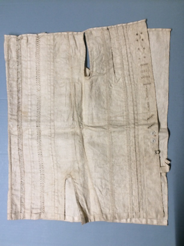 Naailap van wit linnen, verschillende naden, verstelstukken, open naden en dergelijke