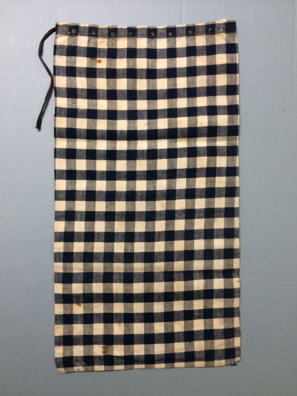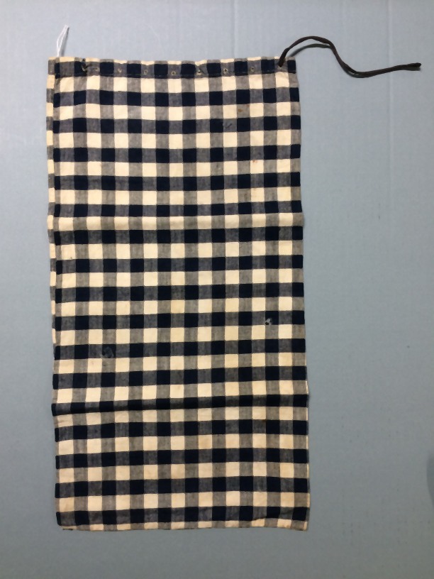 Proefstuk naaien, blauw-wit bont katoen met een ruit van ongeveer 1 x 1 cm.