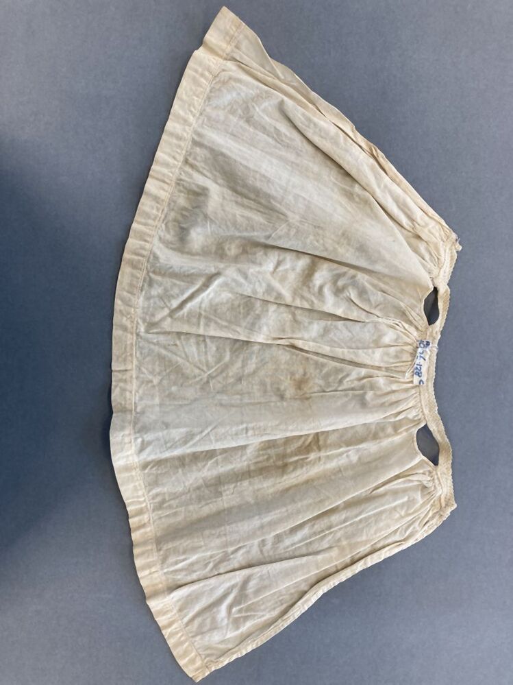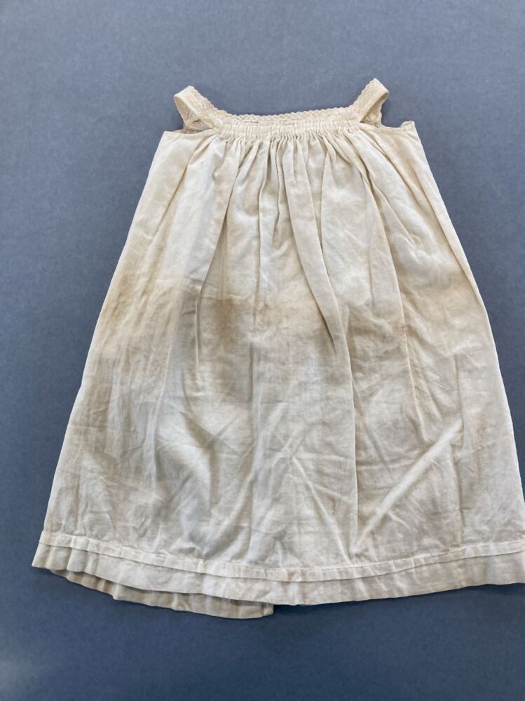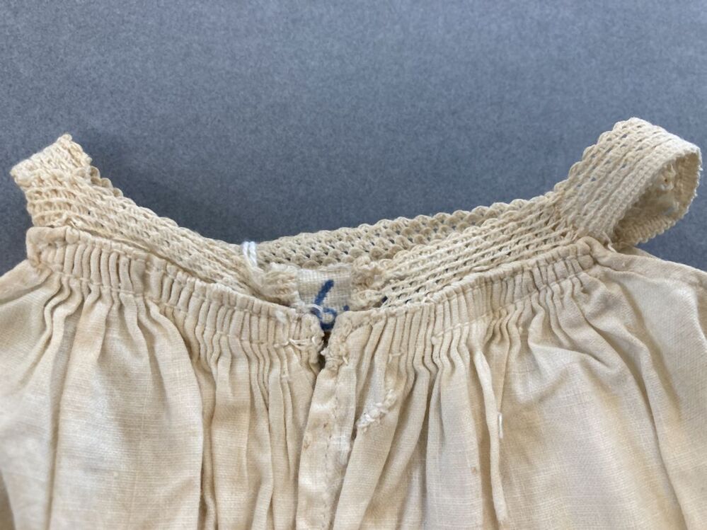 Poppenboezelaar van witte katoen, hals is afgezet met machinaal kant