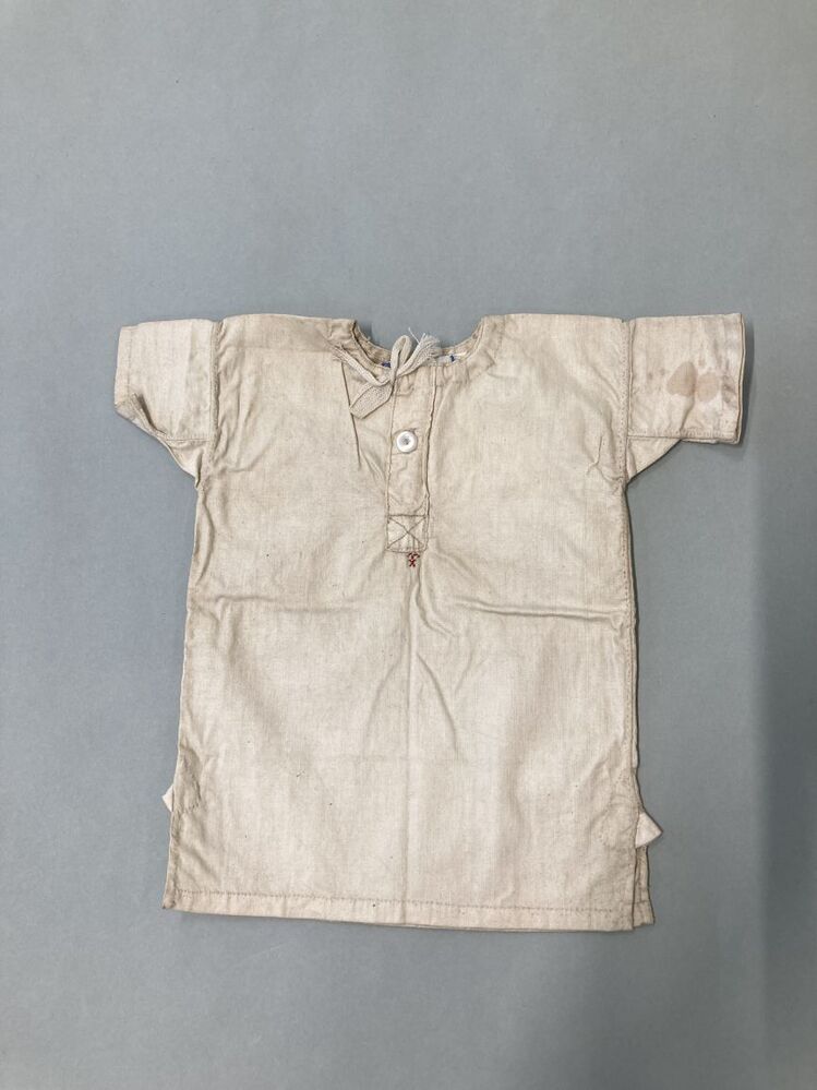 Hemd voor een pop van handgenaaid wit katoen, gemerkt T