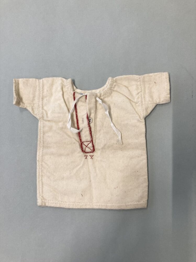 Poppenhemdje met korte mouwen van flanel, split afgezet met rode festonsteken, gemerkt TY