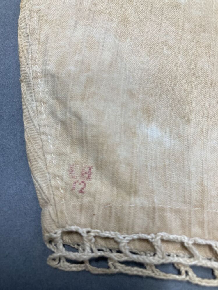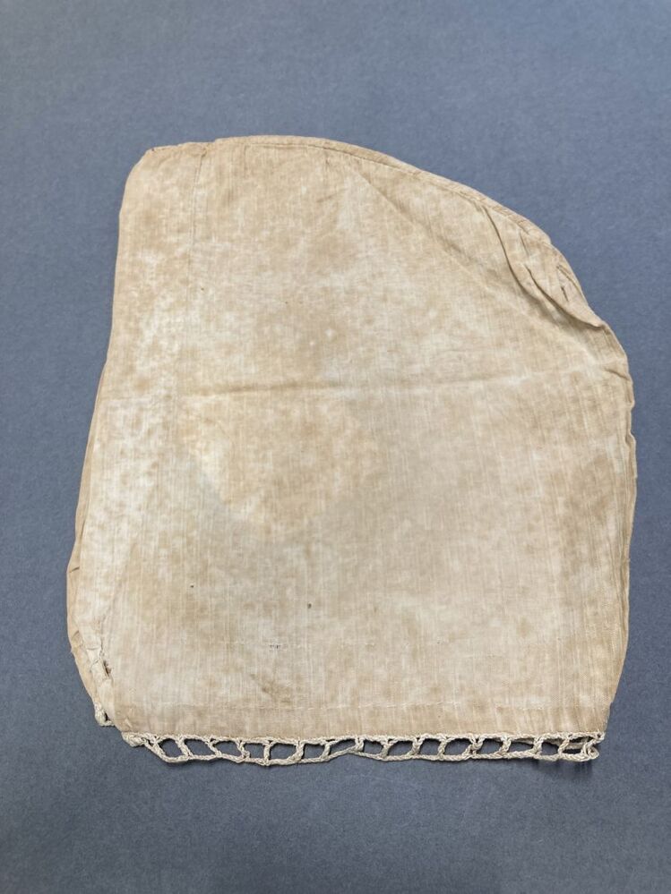 Vrouwenmuts van wit katoen, dubbele streep, gemerkt EH 12