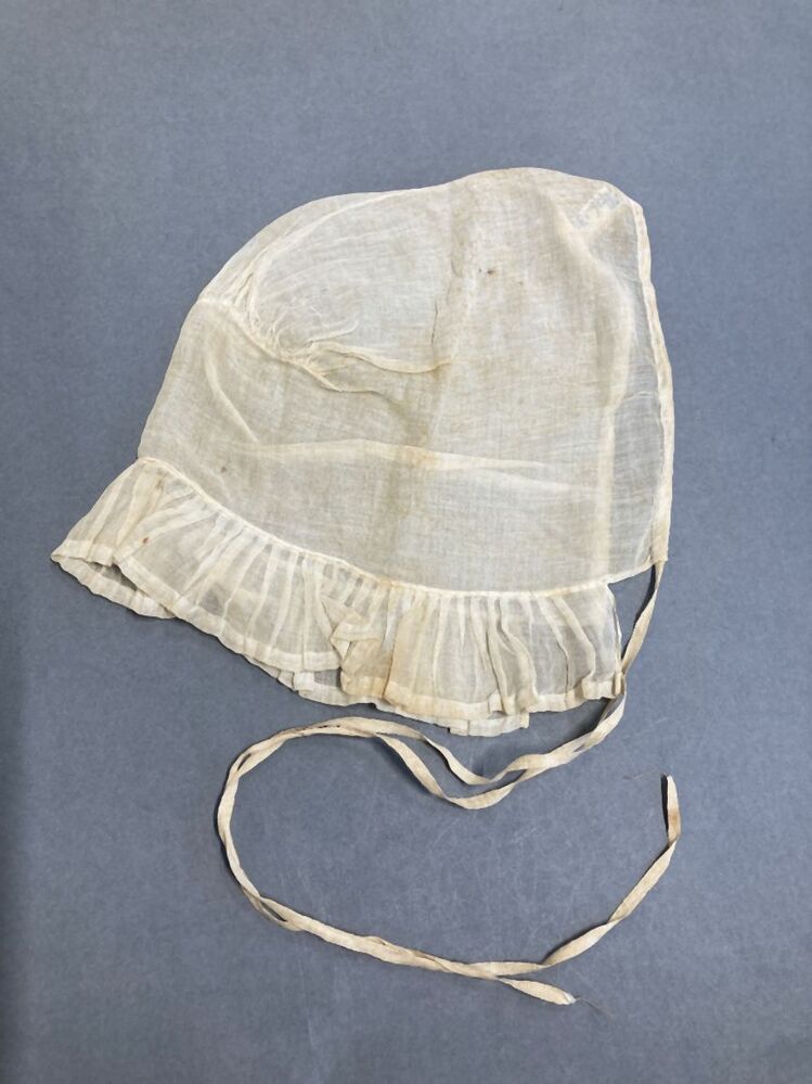 Cornetmuts van neteldoek met volant langs gezichtszijde