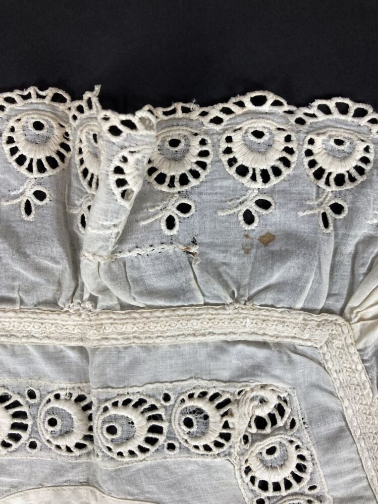 Vierkant kraagje van wit neteldoek, met twee soorten broderieranden