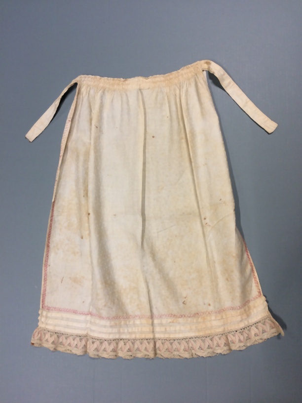 Schort van wit katoen met ingeweven nop-effect, rode taksteek en machinaal kant met rode rijgsteek