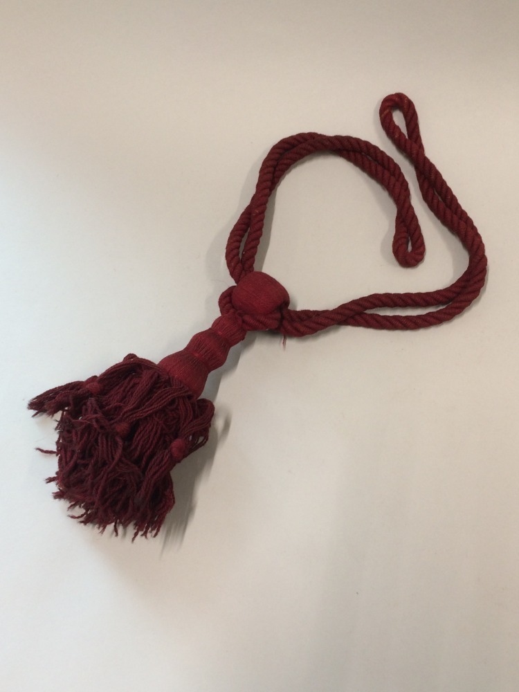 Een van twee gordijnhouder van rode wol, twee lussen met grote kwast