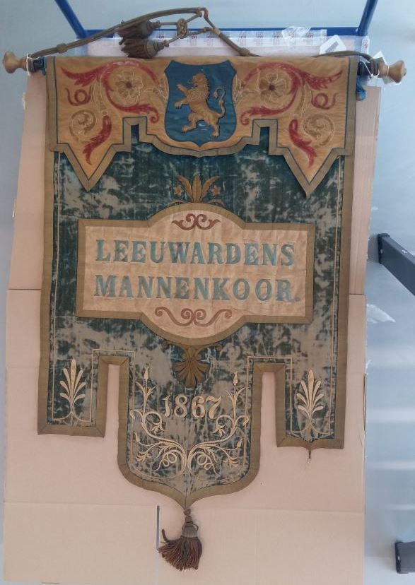 Stuk stof waarop een afbeelding, symbool, logo of opschrift is geschilderd, geborduurd of gedrukt, bedoeld om te worden uitgestald. Het niet strikt rechthoekige maar vaak aan de onderzijde gesegmenteerde vaandel is meestal bevestigd aan een vaandelstok, een horizontale stok aan de bovenzijde van de draagstok. (Religieus Erfgoedthesaurus)