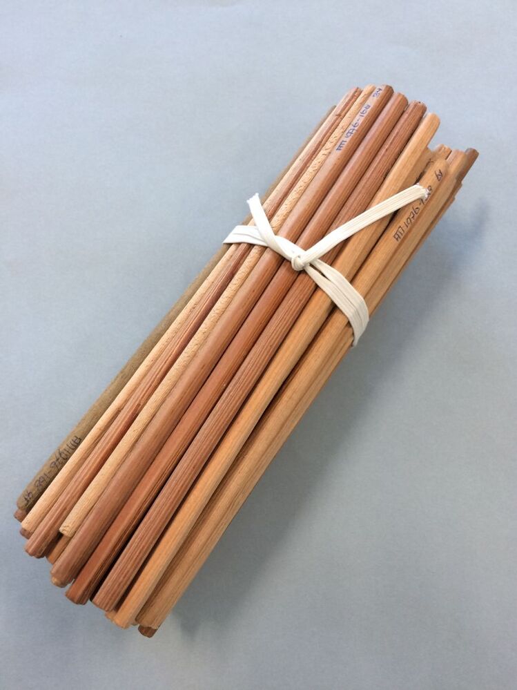 Een deel van 70 stokjes, onderdeel van mutsenpijpraam met 70 stokjes