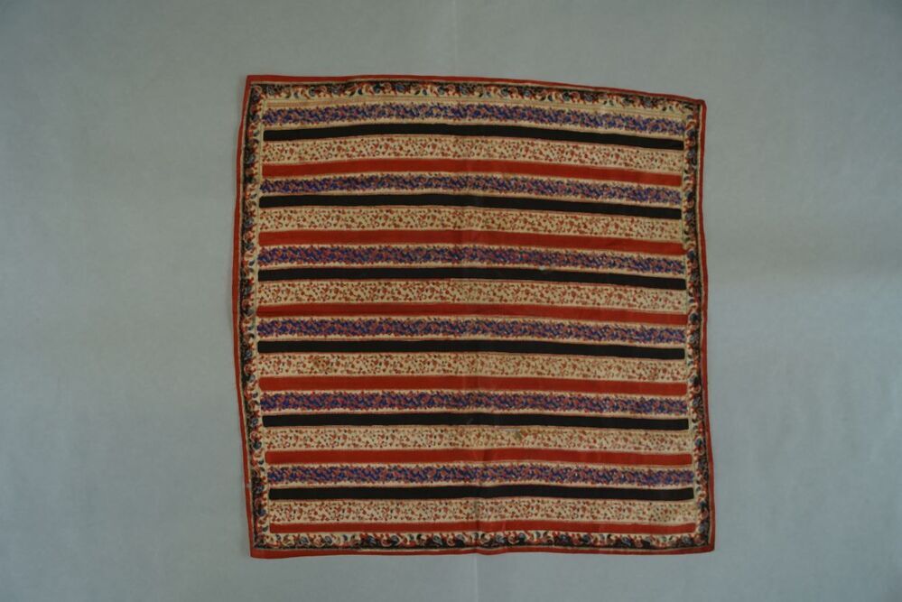 Zijden doekje of sjaal met bedrukt patroon, imitatie Kasjmier-weefsel met lengtestrepen in rood, wit en zwart