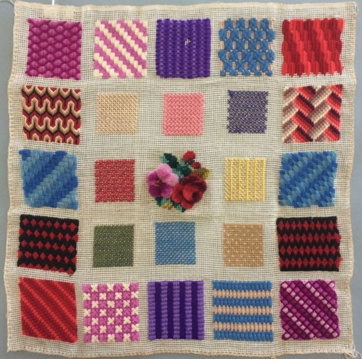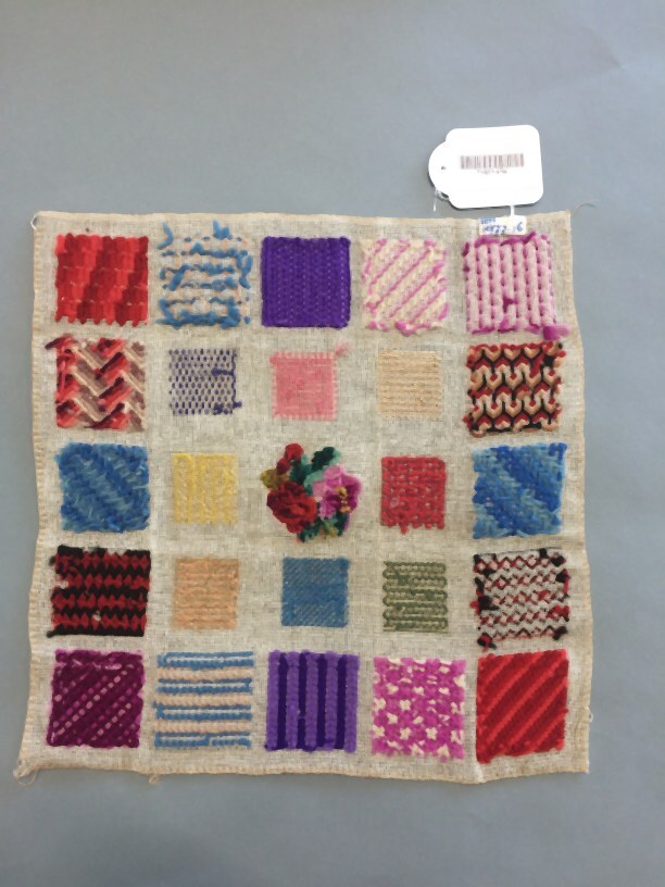 Proeflap van wollen tapisserie op stramien, in het midden een boeket rozen