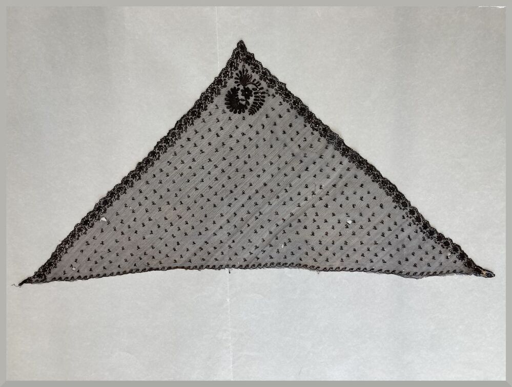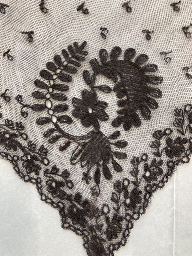 Zwarte fichu, getamboereerd met zwart garen, met ajour parel schulprand