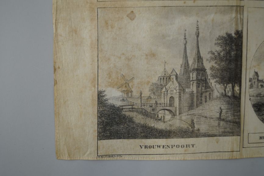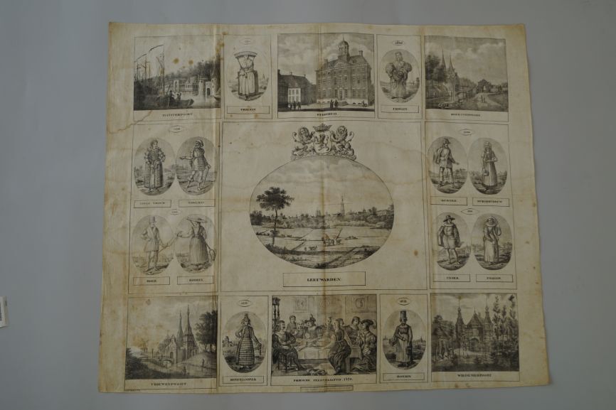 Gedenkdoek van bedrukt katoen met dertien vierkanten waarin Leeuwarder stadsgezichten