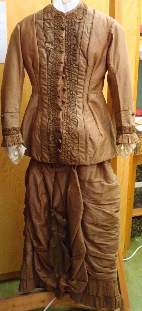 Rok van tweedelige kurasjapon van beige-bruine wollen stof met bruin satijn, gedragen als trouwjurk