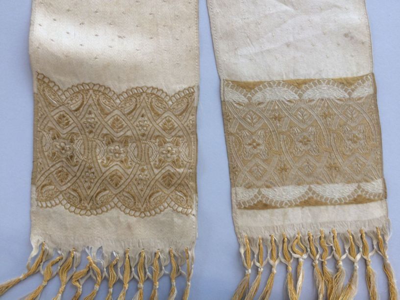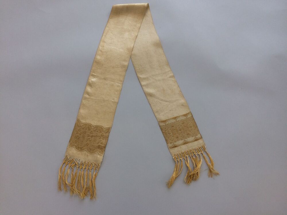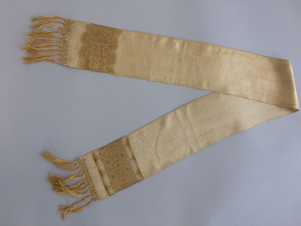 Langwerpig zijden sjaaltje, ecru met geel, ingeweven randen aan de uiteinden en aangeknoopte franje