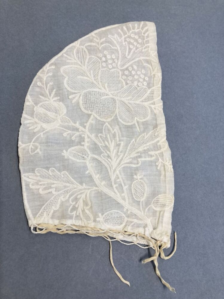 Muts van neteldoek, verfraaid met tamboereerwerk en perzisch ajour, volant langs gezichtszijde verdwenen