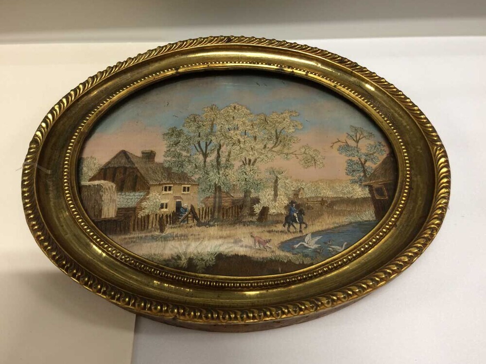 Verwijst naar werken die zich kenmerken door een patroon of ontwerp dat is uitgevoerd in met draad of fijn metaaldraad gemaakte steken. De patronen worden gewoonlijk uitgevoerd op stof, maar ook leer, papier of andere media kunnen worden gebruikt; de werken kunnen bedoeld zijn om ingelijst te worden of om kleding, bedtextiel, meubelbekleding, kussens, altaarkleden, ceremoniële voorhangen of andere zaken te versieren. (AAT)
