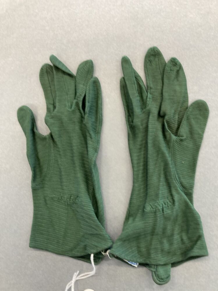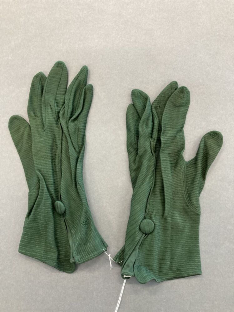 Paar handschoenen van donkergroen tricot met dwarsstreepjes, machinaal gebreid