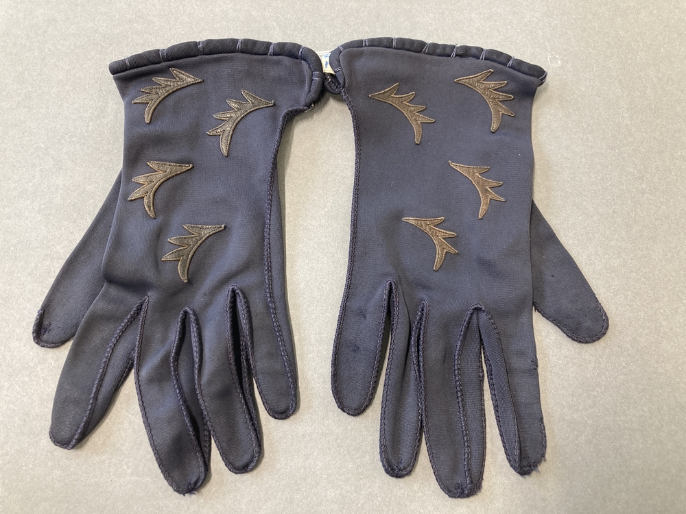 Paar handschoenen van donkerblauw nylon tricot met applikatie