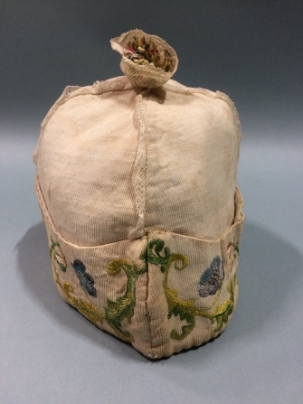 Kraamherenmuts van geribt katoen gevoerd met piqué, op omgeslagen onderkant floraal zijde borduursel, afgezet met kloskant