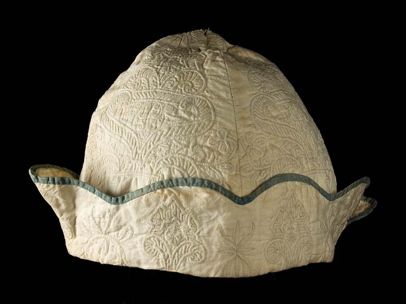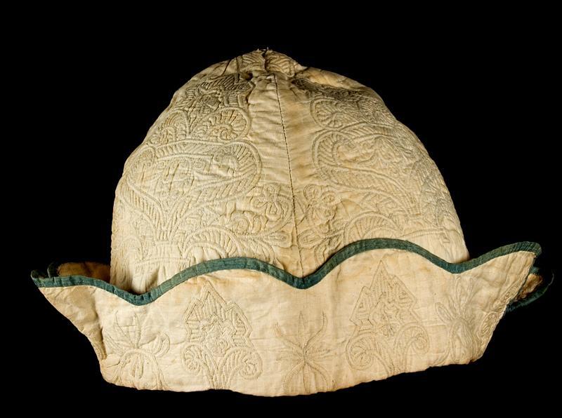 Kraamherenmuts van wit katoen met zaans stikwerk, afgewerkt met blauwe ribszijde