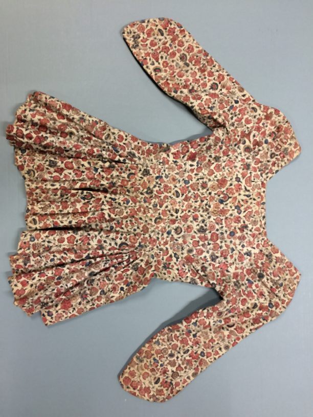 Sitsen vrouwenjak, waarin twee verschillende sitsen zijn verwerkt, zowel met dunne bloemranken met veelsoorige bloemen als dikke stengels met gestileerde bloemen op witte grond