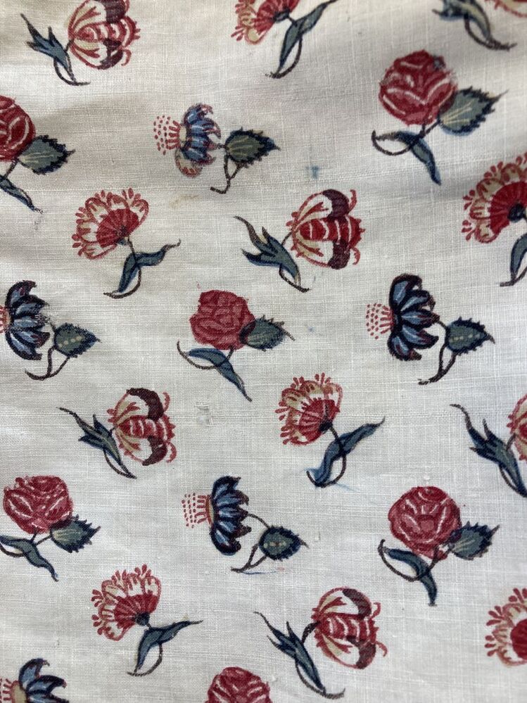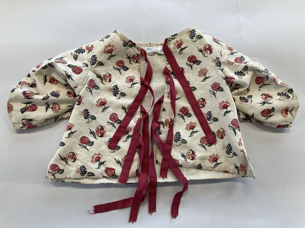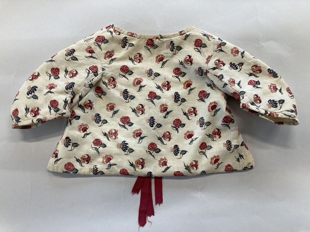 Sitsen babyjakje, beschilderd met enkelvoudige bloempjes op diagonale rijen op witte grond
