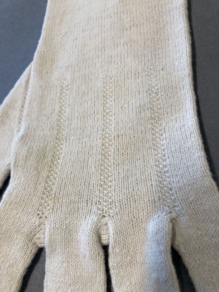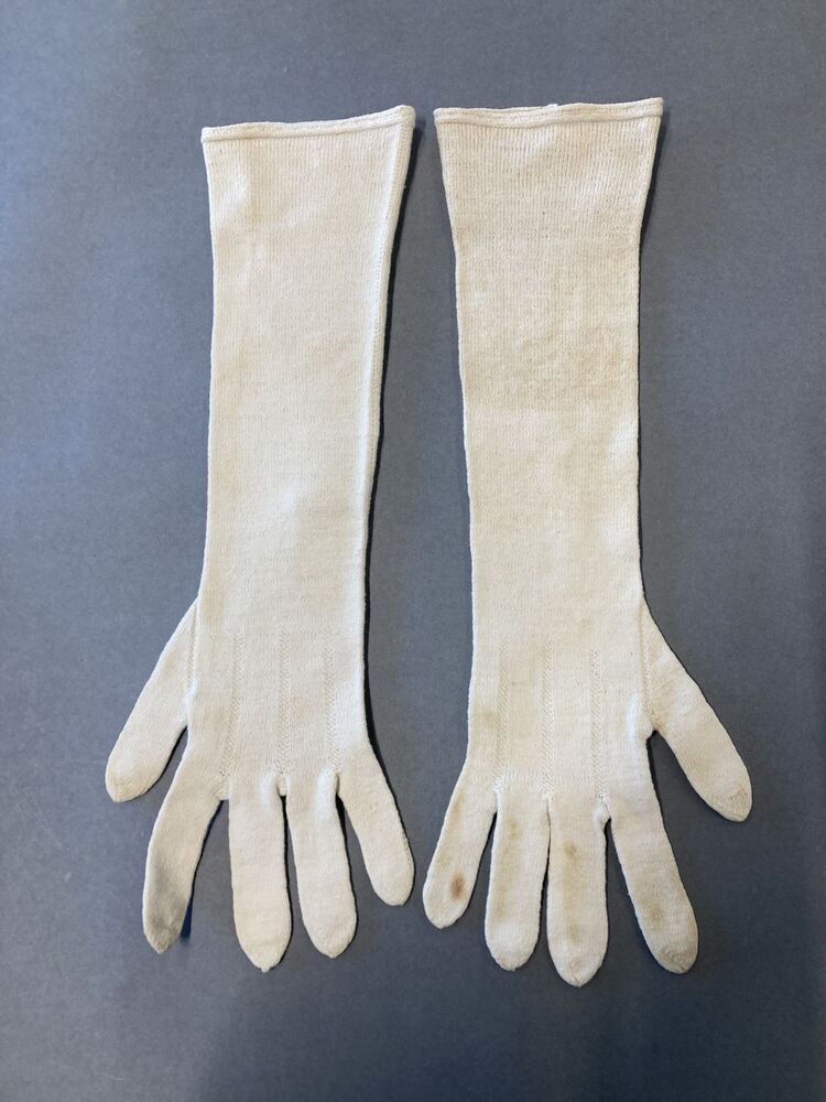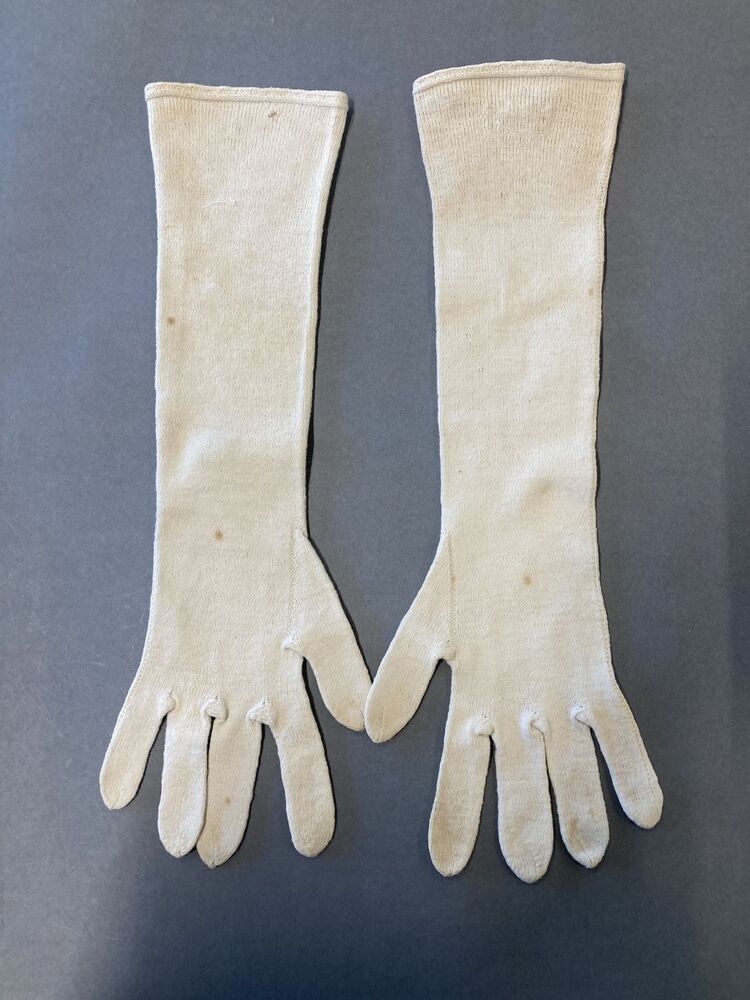 Paar lange handschoenen gebreid van wit katoen, recht tricot