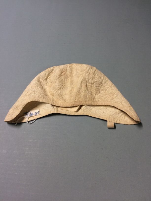 Meisjes mutsje van wit linnen met geborduurd rivière motief en elkaar kruisende cirkels