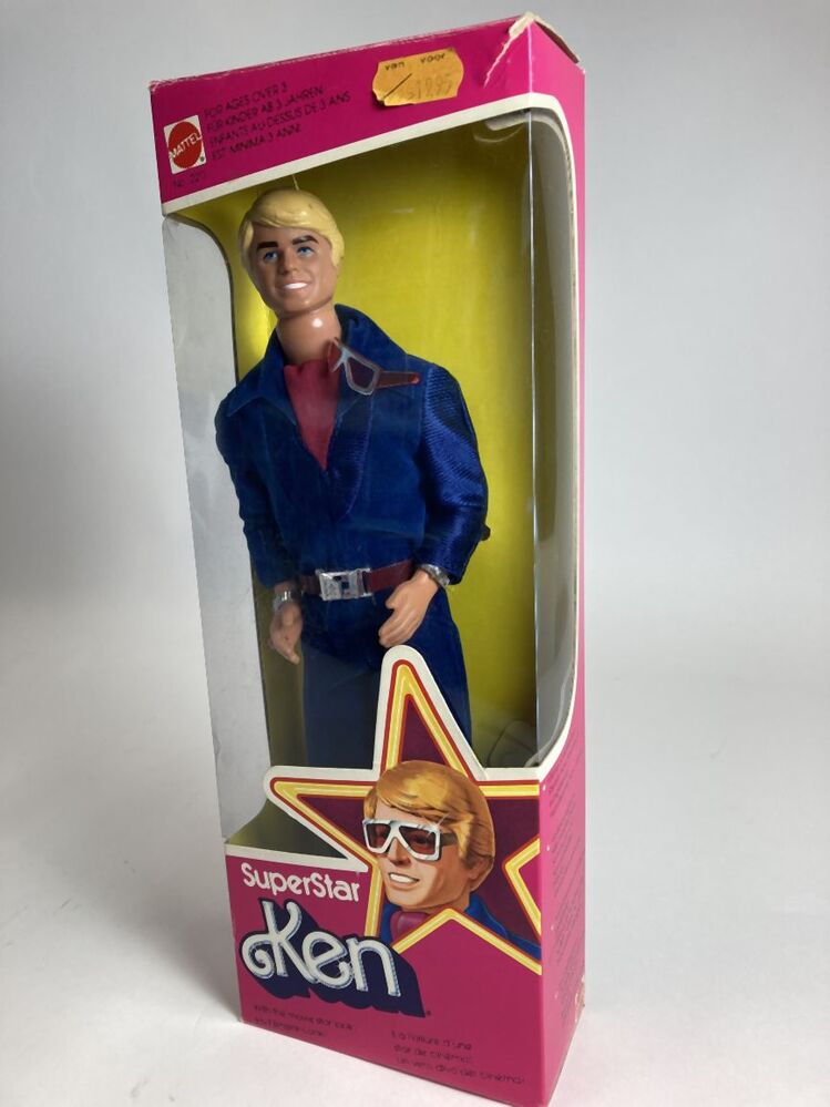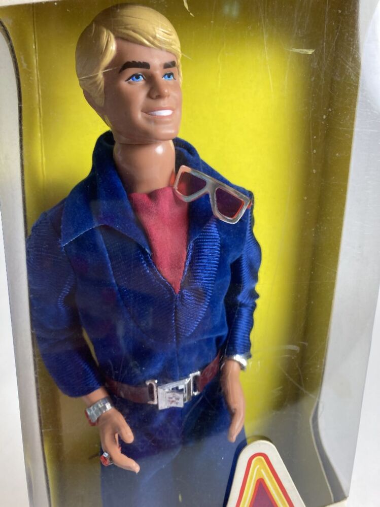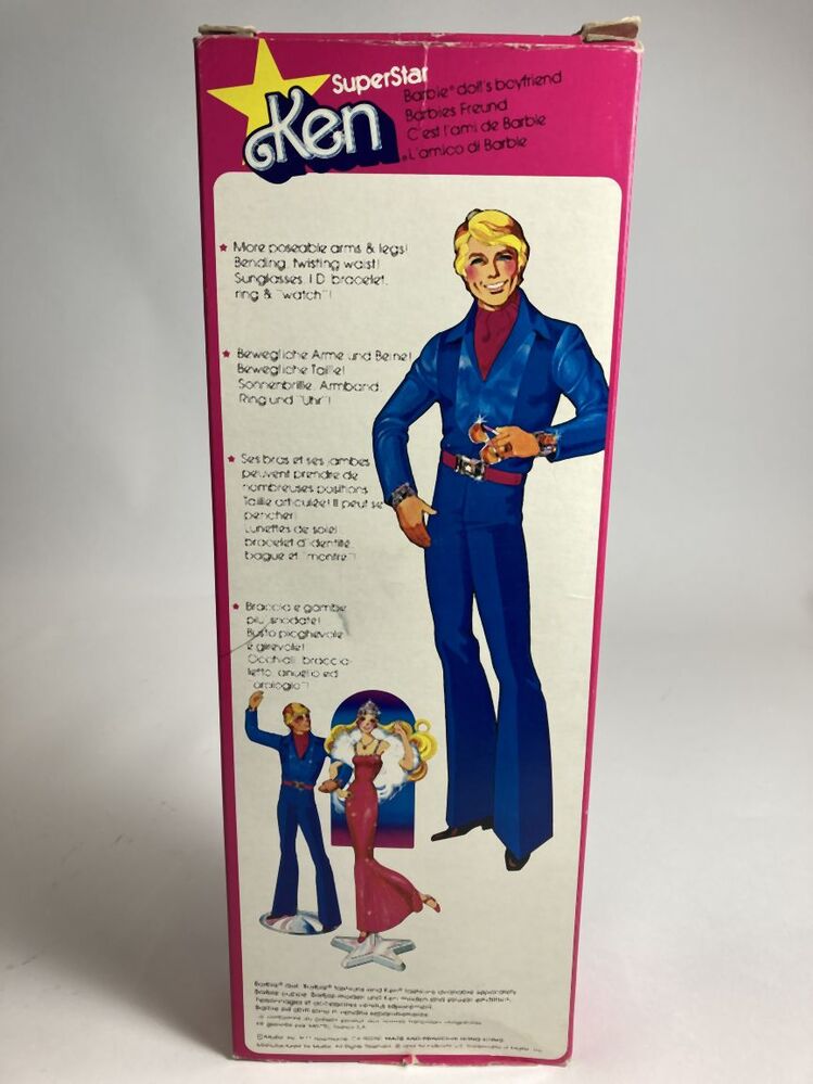 Ken 2211, van roze-oranje kunststof, man in blauw pak met rode accesoires, horloge, armband, ring, zonnebril, gesp en zwarte schoenen op zwarte grondplaat