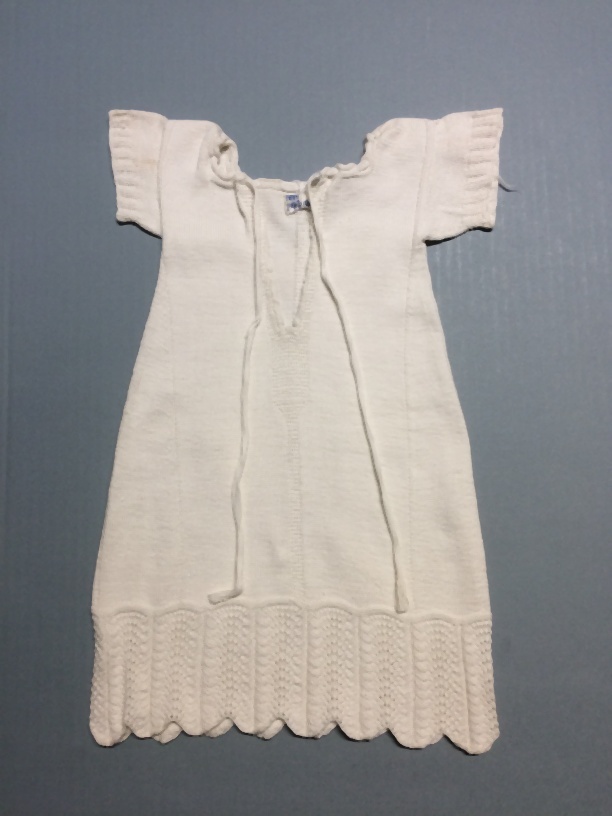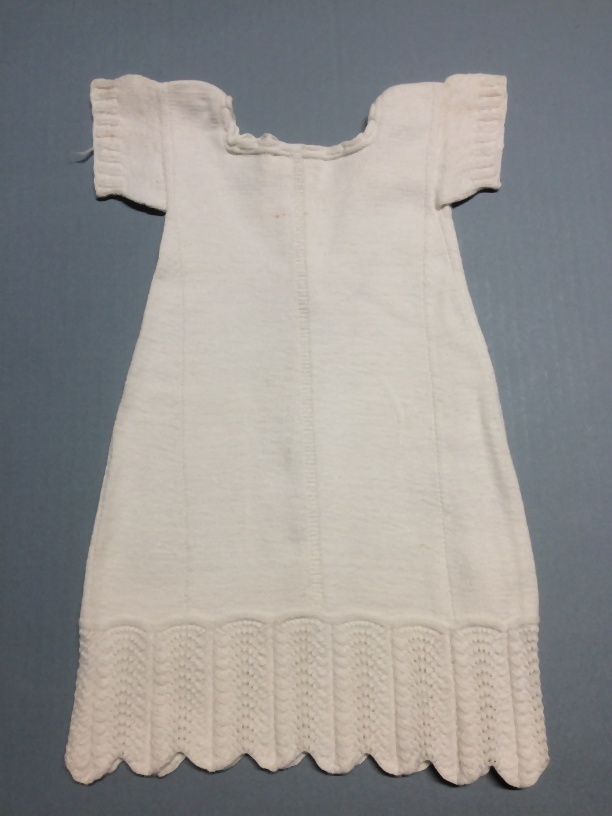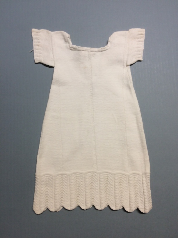 Poppenhemd van wit katoen, gebreid met ajourpatroon